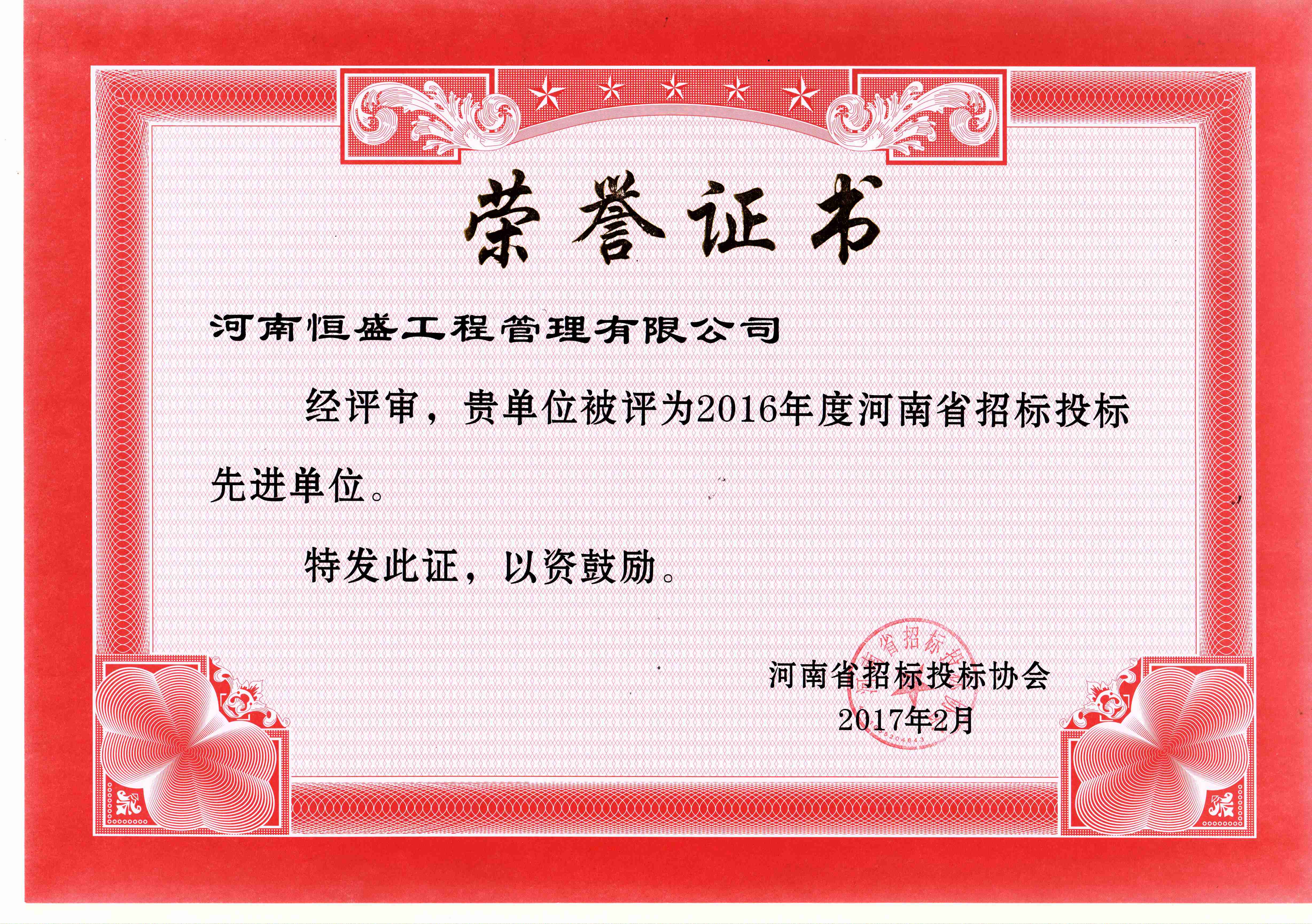 2016年度河南省招标投标先进单位