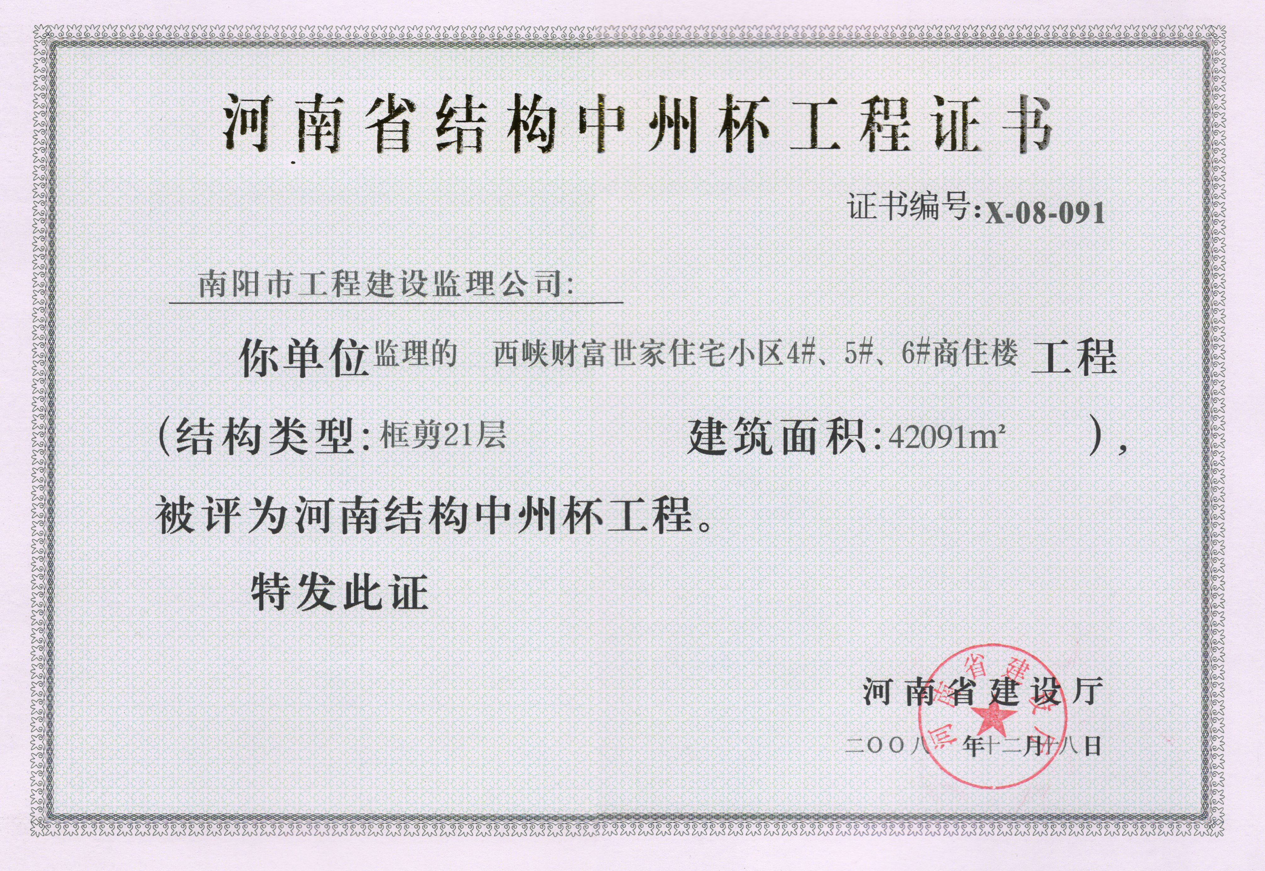 2008河南省结构中州杯(西峡财富世家)