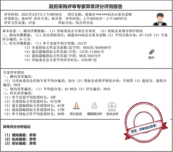 如图是江苏省南通市政府采购评审专家的一份异常评分检测报告。从图上的分析结论来看,张姓评委在横向偏离、纵向偏离都超过了预设的阈值(极限值),尤其是时长偏差明显有悖于常理。因为其在单页的平均浏览时间只有4秒,47份投标文件、4000多页的文本在短短67分钟内就评审完毕,显然是不符合评审规律的(甚至可以得出部分投标文件根本没有浏览的结论),因此判定其存在异常评分证据确凿无疑。